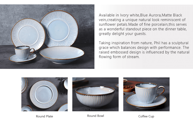 Доступный в цвете слоновой кости белый, синий аврора, матовый черный, создавая уникальный естественный вид, напоминающий лепестки подсолнуха. Изготовлен из тонкого фарфора, он служит прекрасным выдающимся предметом на обеденном столе, очень радует ваших гостей.Черпая вдохновение у природы, Фил обладает скульптурной грацией, которая сочетает в себе дизайн и производительность.Рельефный рисунок подчеркивает естественную плавную форму ручья.